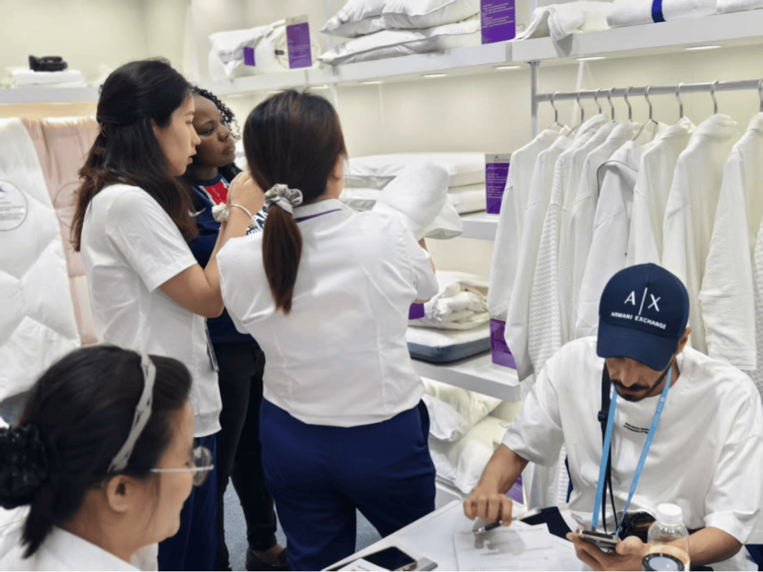 展位处,陕西雅兰寝饰及南通弘雅织业的外贸团队热情欢迎每一位参不雅交换的商客。以专业细致的取清晰流利的演示,全方位展示产物立异工艺及使用场景,帮力商客深度洞悉产物及办事劣势,挖掘合做潜力。