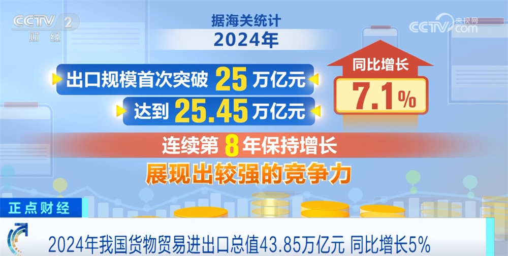 对外经贸大学中国世界商业组织研究院院长屠新泉称:“2024年我国外贸进出口成就亮眼,外贸总量、增量和质量都获得显著提拔。进出口商业额创出新高,全年实现商业顺差跨越1万亿美元。出格是这些成就是正在我国曾经具有40万亿庞大存量的根本上取得,实为难能宝贵。”正在13日上午国新办举行的旧事发布会上,海关总署副署长王令浚引见,2024年我国货色商业进出口总值43。85万亿元,总量、增量、质量“三量”齐升,规模再创汗青新高。2024年,我国货色商业进出口总值43。85万亿元,同比增加5%。此中,出口规模达到25。45万亿元,同比增加7。1%,持续第8年连结增加。进口18。39万亿元,同比增加2。3%。