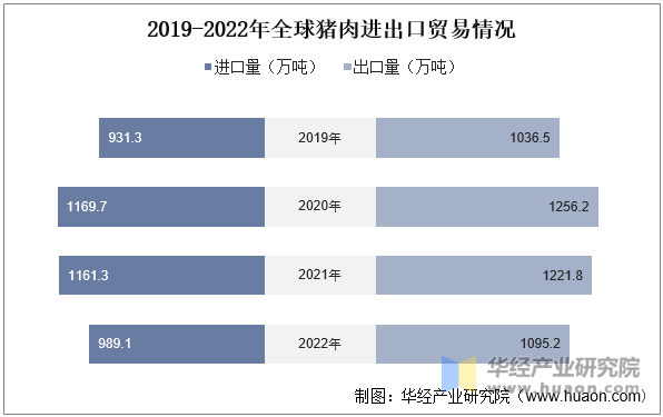 从全球猪肉产销量环境来看,近年来,全球猪肉产量及销量稳步增加,2019-2020年受非洲猪瘟及疫情的影响,猪肉产量及需求量有所下滑,跟着疫情被无效节制以及市场需求的回升,全球猪肉产销量也随之恢复增加。据材料显示,2022年全球猪肉产量为11457。7万吨,同比增加6。2%;消费量为11339。9万吨,同比增加5。6%。近年来全球猪肉进出口规模全体呈增加的态势。据材料显示,2022年全球猪肉进口量为989。1万吨,同比下降14。8%;出口量为1095。2万吨,同比下降10。4%。